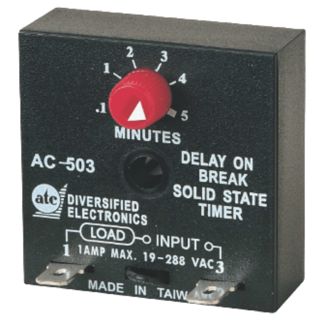 This field adjustable model will operate on control voltages of 19 VAC through 288 VAC. Unlike most universal voltage timers, the AC-503 is a two (2) terminal device that simply connects in series with the control voltage, thermostat and control relay making for easy installation. This timer is engineered to provide true thermostat interruption protec-tion even when there is a continuous current flow through the thermo-stat’s cooling anticipator.